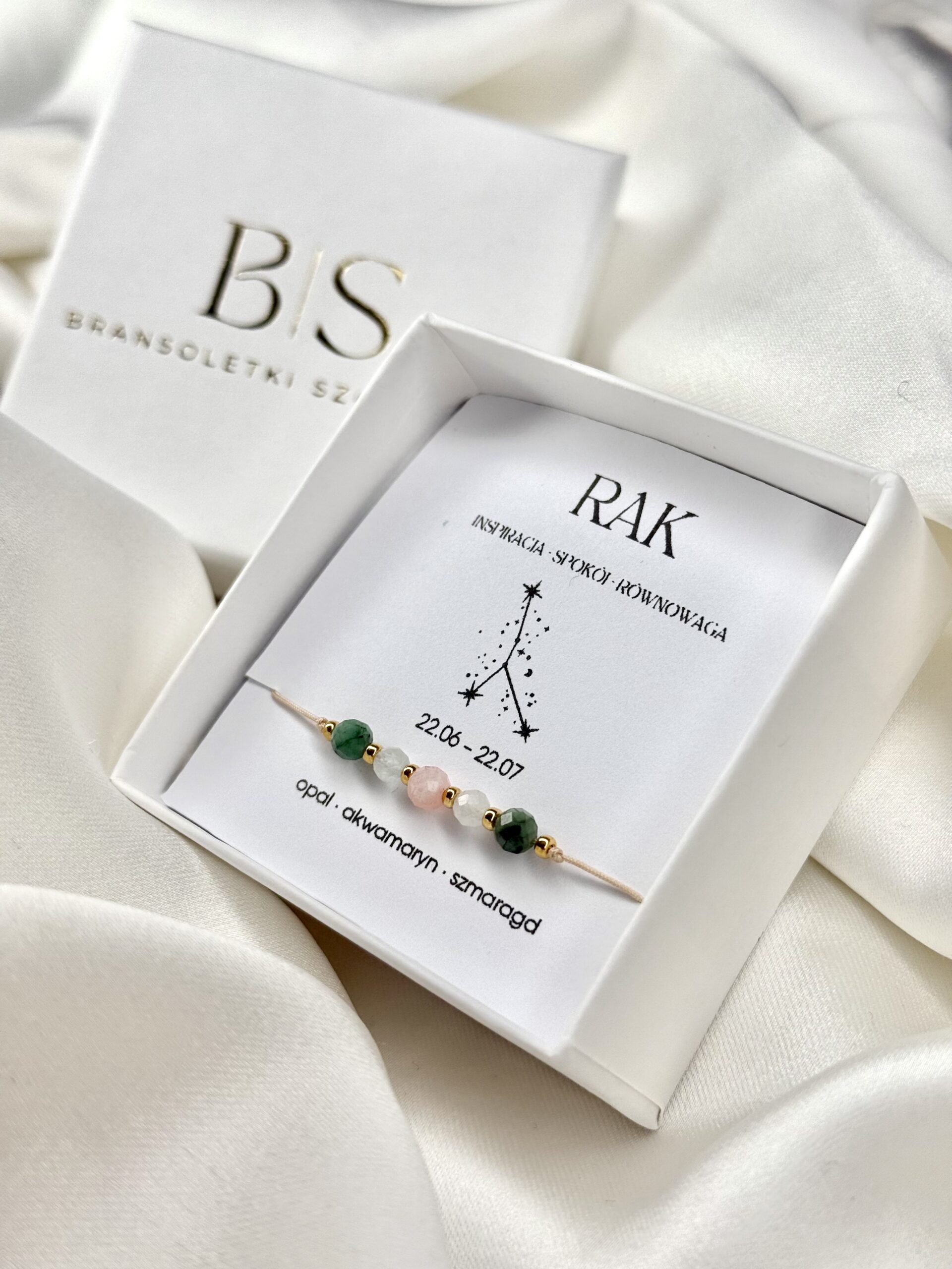 Bransoletka znak zodiaku Rak wykonana ręcznie z naturalnymi kamieniami: opalem, akwamarynem i szmaragdem na eleganckim, beżowym sznurku nylonowym. Regulowany rozmiar dzięki makramowemu wiązaniu. Idealna dla osób urodzonych pod znakiem Raka (22.06-22.07) oraz wszystkich ceniących wyjątkową biżuterię harmonizującą z wrażliwą, opiekuńczą naturą.