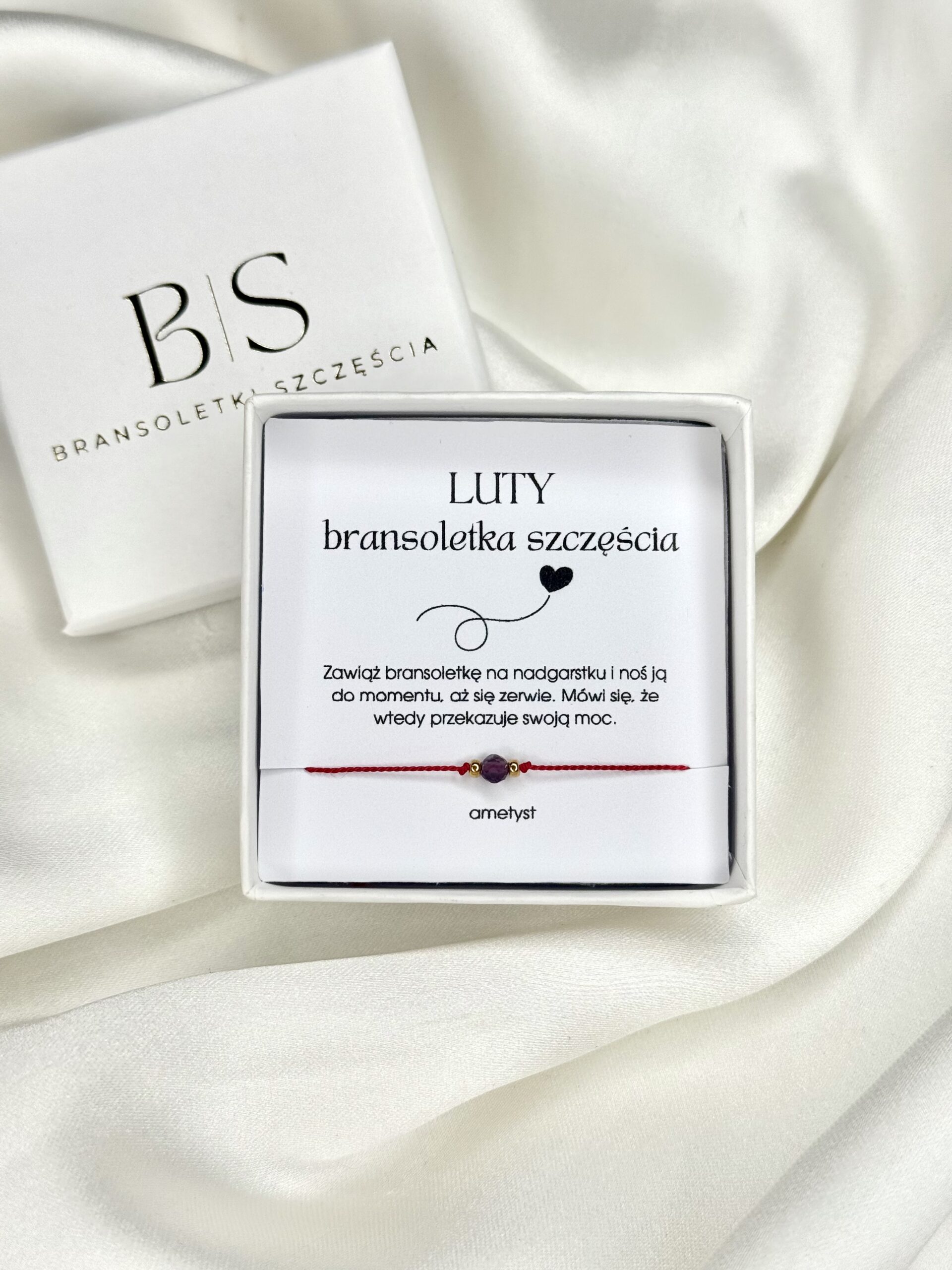 W bransoletce ametyst na szczęście luty energia tego królewskiego kamienia splata się z tradycyjną czerwoną nicią, tworząc talizman o szczególnej mocy dla osób urodzonych w tym miesiącu.