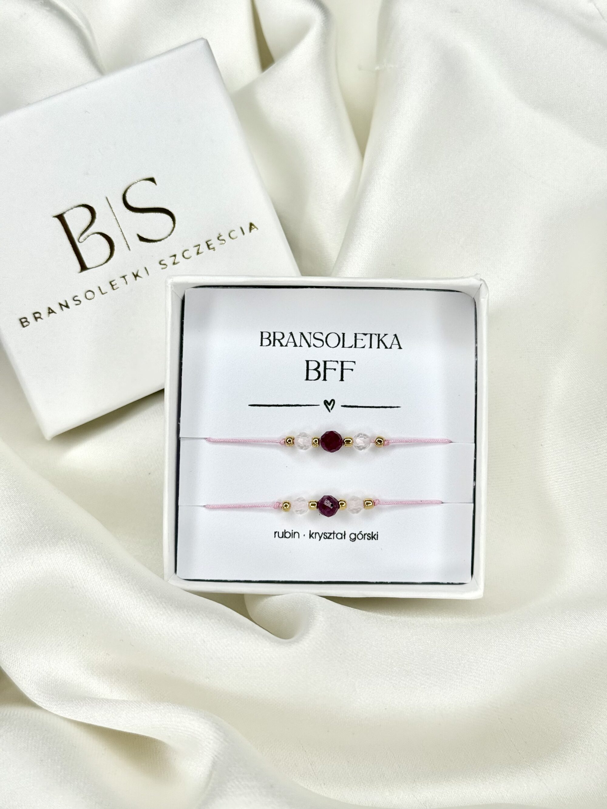 Bransoletka BFF to wyjątkowy zestaw bransoletek przyjaźni, który idealnie symbolizuje nierozłączną więź między najlepszymi przyjaciółkami. Ręcznie robione na delikatnym różowym sznurku nylonowym, ozdobione naturalnym kryształem górskim i rubinem, emanują wdziękiem i subtelną elegancją.