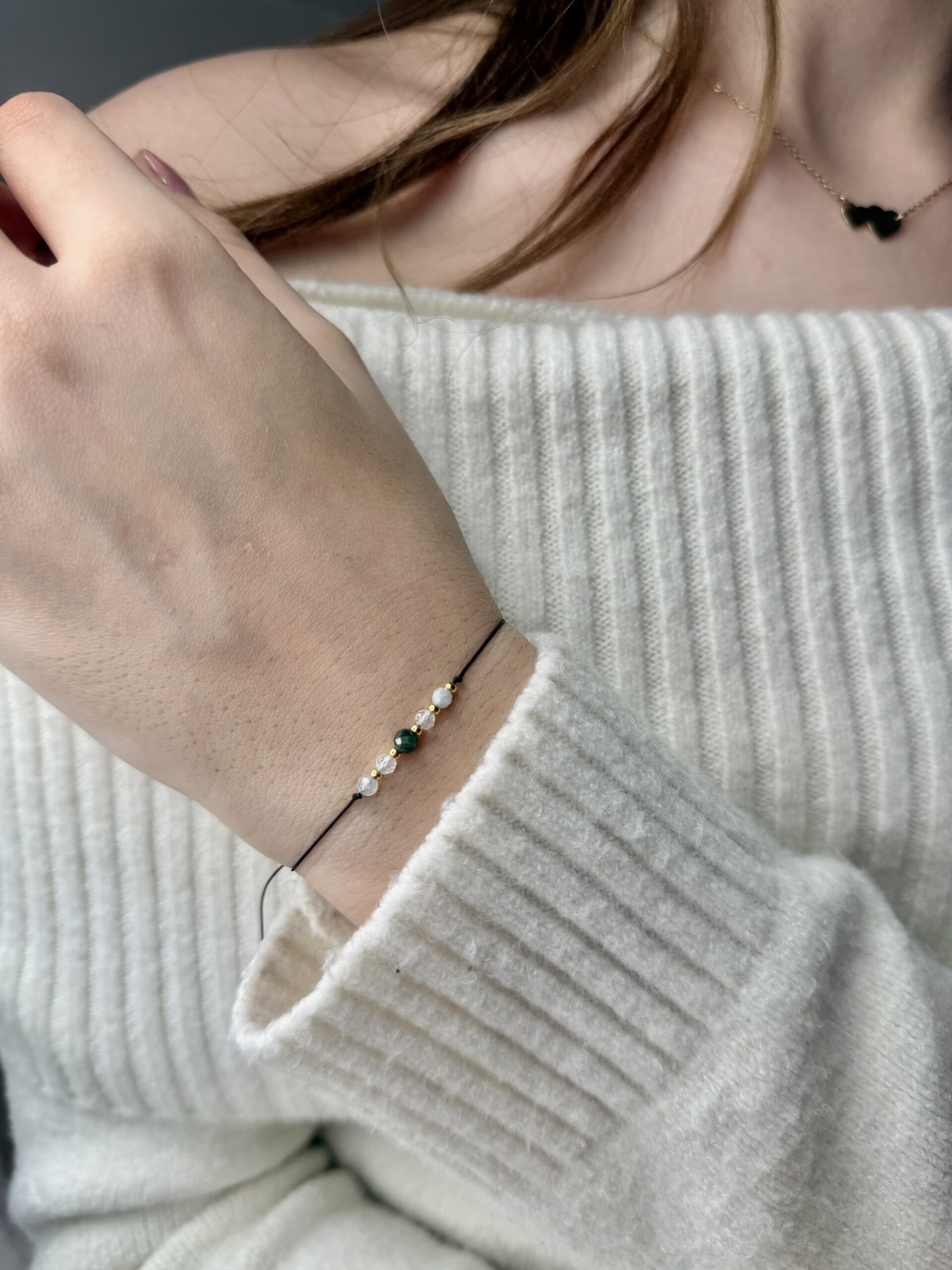 - Materiał: Wysokiej jakości czarny sznurek nylonowy, naturalne kamienie, złote koraliki
