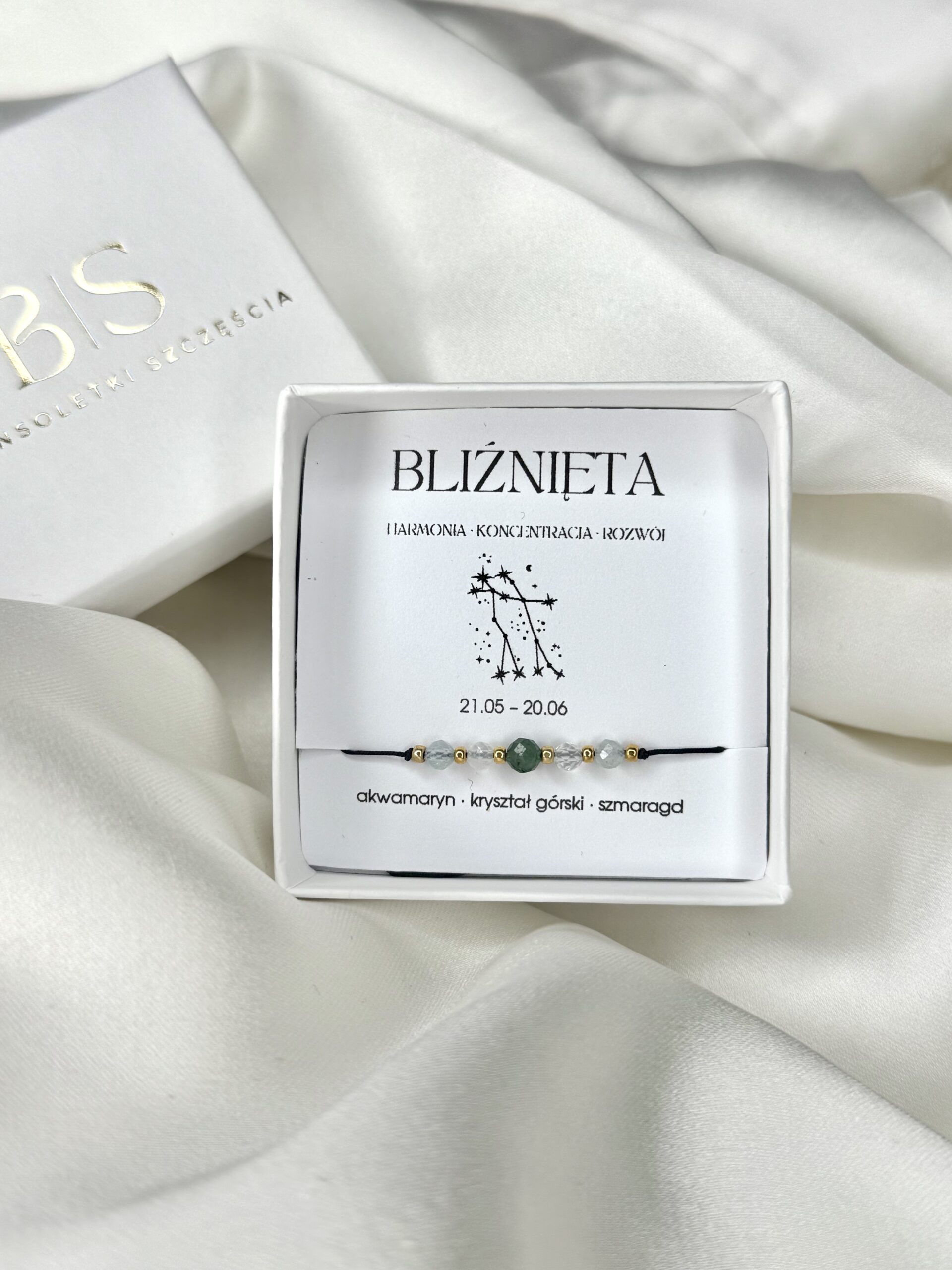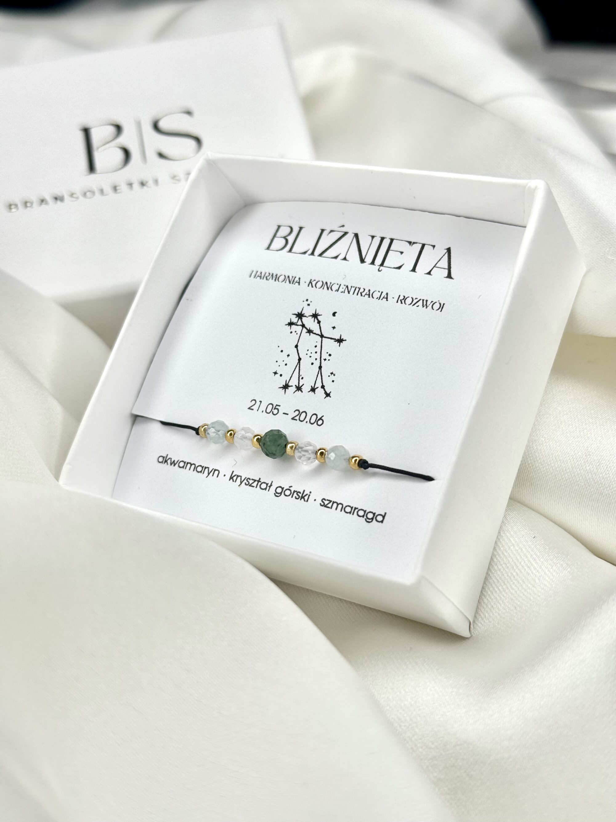 Bransoletka Znak Zodiaku BLIŹNIĘTA to wyjątkowy wybór dla osób urodzonych pod znakiem Bliźniąt lub tych, którzy pragną wzbogacić swoją biżuterię o energetyczny element. Połączenie akwamarynu, kryształu górskiego i szmaragdu tworzy harmonijną kompozycję energetyczną, która wspiera komunikację, koncentrację i równowagę emocjonalną.