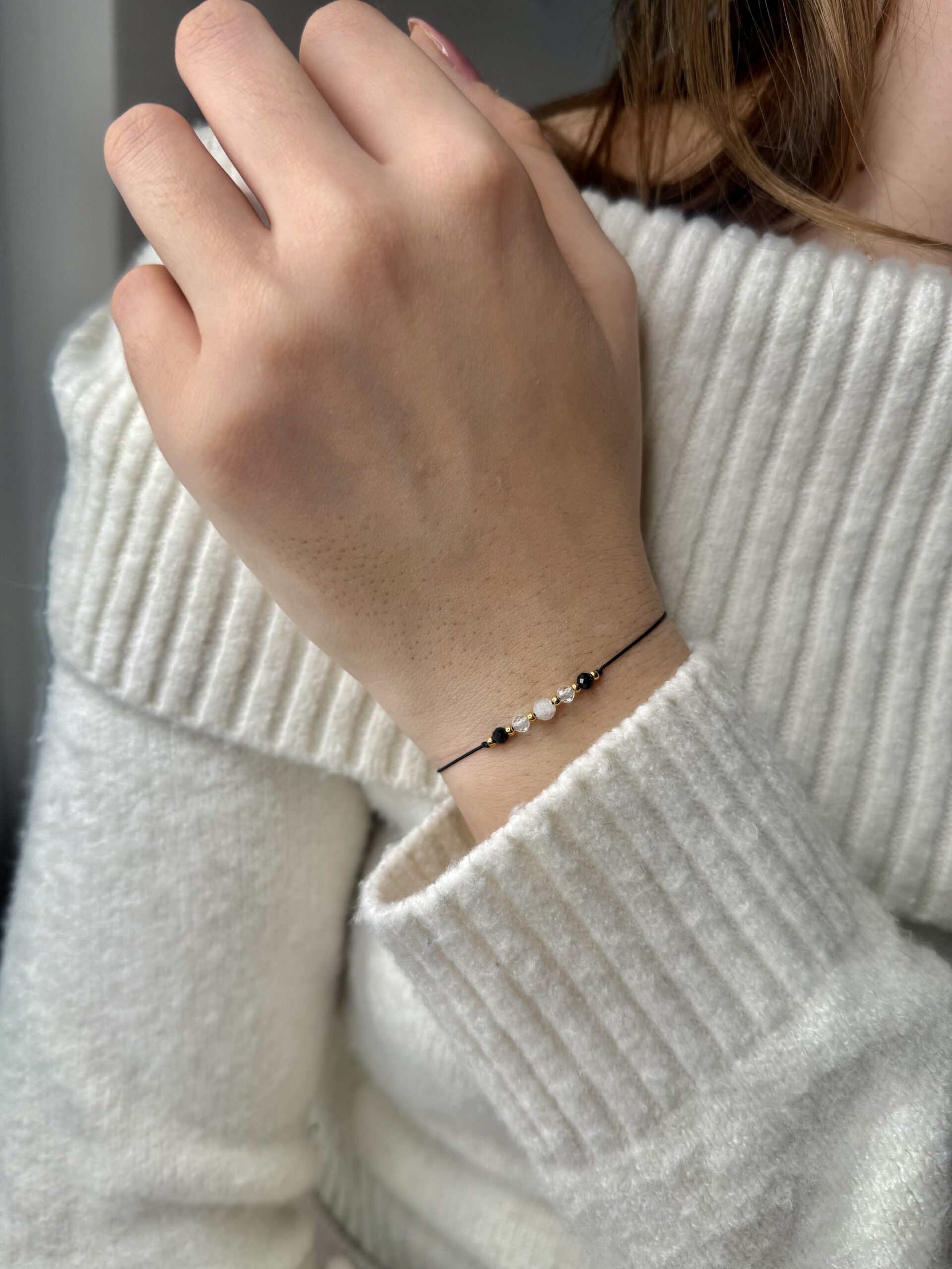 Bransoletka znak zodiaku Koziorożec została ozdobiona starannie dobranymi kamieniami naturalnymi: czarnym turmalinem, kryształem górskim i kamieniem księżycowym. Ta wyjątkowa kompozycja minerałów nie tylko tworzy efektowny kontrast z czarnym sznurkiem, ale również harmonizuje z praktyczną i zdyscyplinowaną naturą Koziorożca.