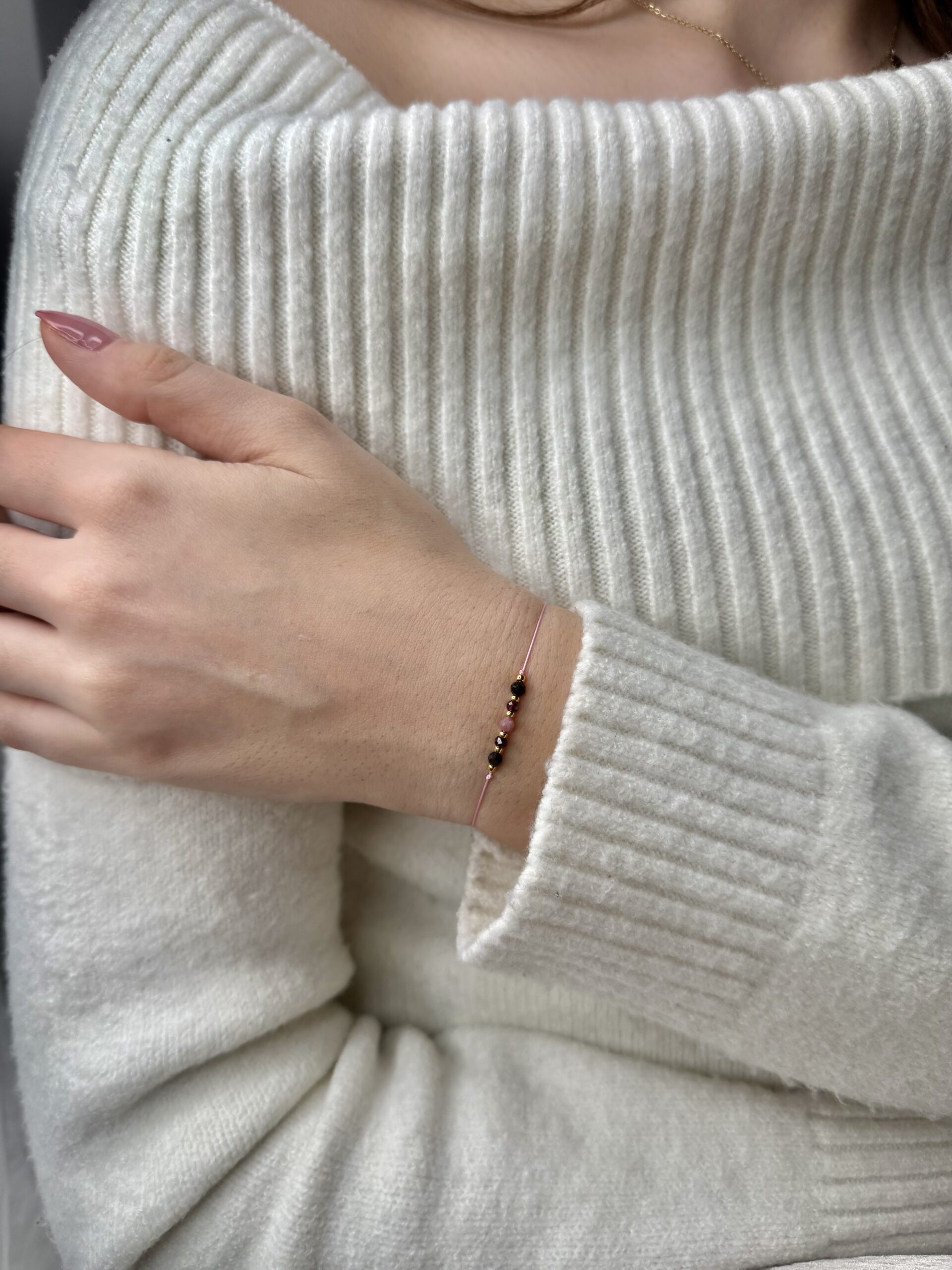 Zdobiona trzema potężnymi kamieniami naturalnymi: czarnym obsydianem, granatem oraz różowym turmalinem, bransoletka łączy mistyczną elegancję z mocą ochronną, oferując stylowy dodatek, który wspiera wewnętrzną siłę i emocjonalne uzdrowienie.