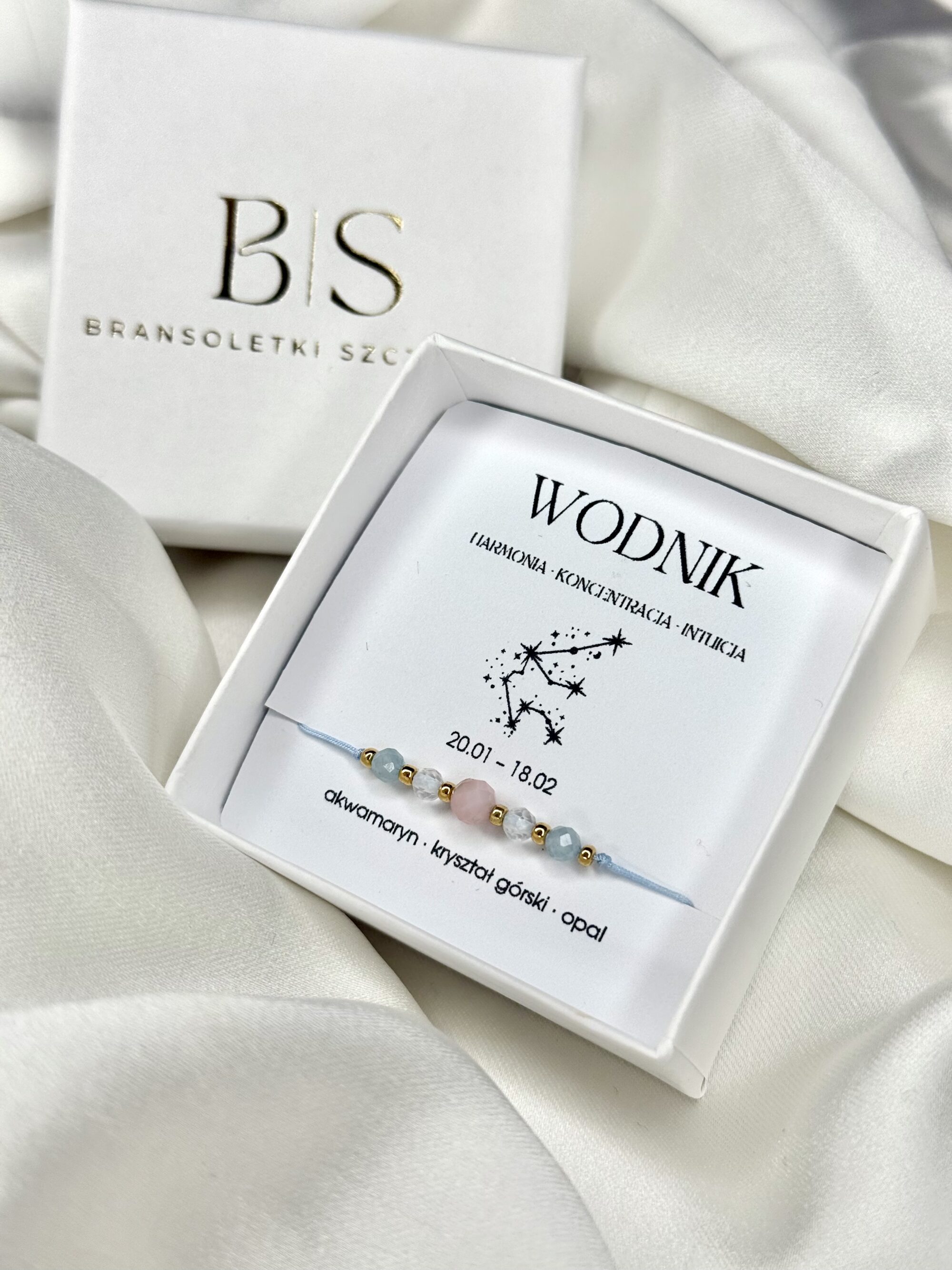 Bransoletka Znak Zodiaku WODNIK to wyjątkowy wybór dla osób urodzonych pod znakiem Wodnika lub tych, którzy pragną wzbogacić swoją biżuterię o oryginalne akcenty. Połączenie akwamarynu, kryształu górskiego i opalu tworzy harmonijną kompozycję energetyczną, która wspiera innowacyjność, niezależność myślenia i wewnętrzny spokój.