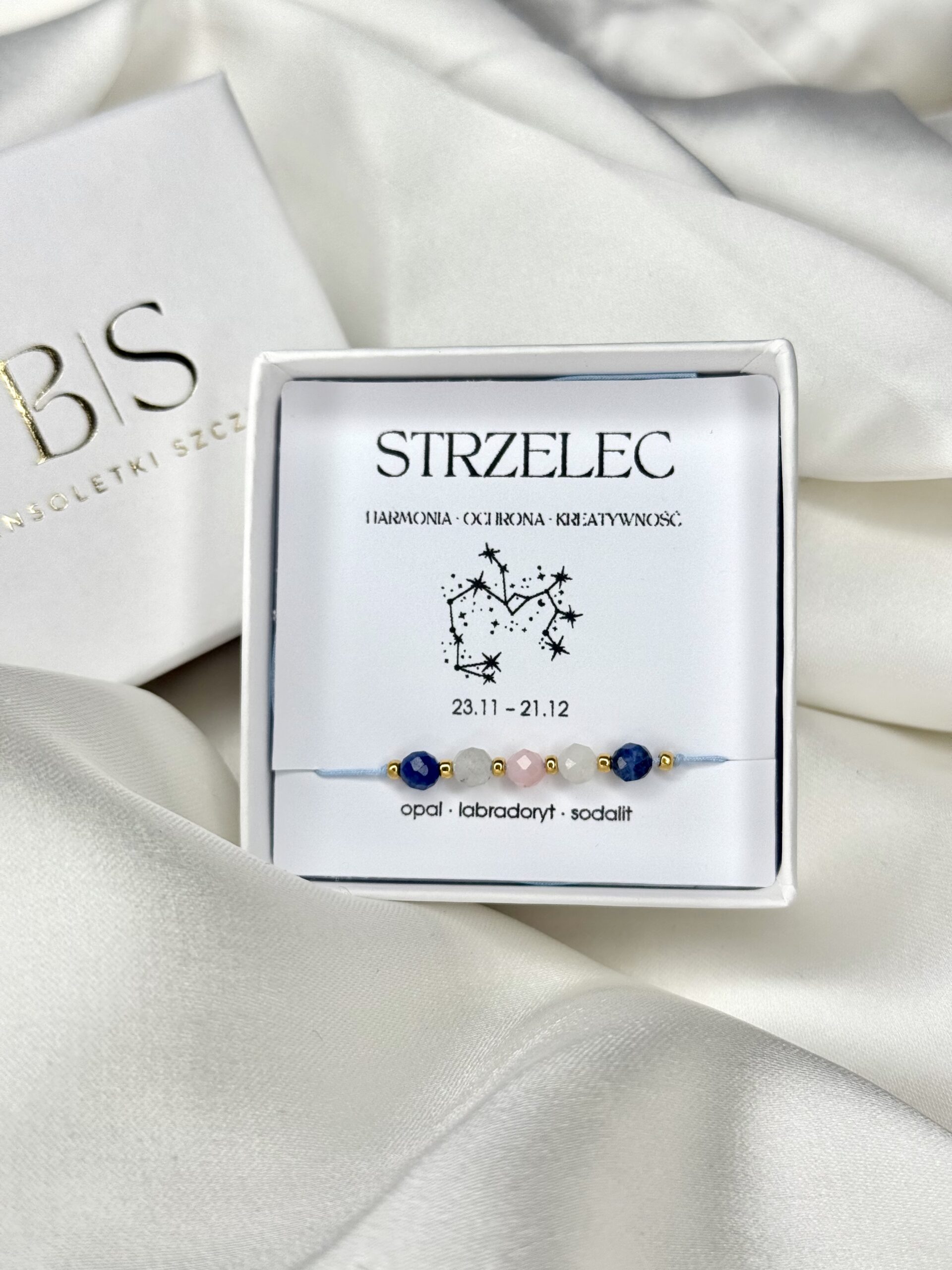 Bransoletka Znak Zodiaku STRZELEC z naturalnymi kamieniami – opalem różowym, labradorytem i sodalitem na eleganckim niebieskim sznurku nylonowym. Regulowany rozmiar dzięki wiązaniu makramowemu. Idealny talizman dla Strzelców, wspierający odkrywanie wewnętrznych talentów i wprowadzanie pozytywnych zmian w życiu.